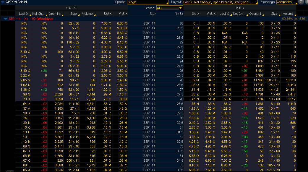 The exponential downward movement (minus the minor volatility flashes of 2010 and 2011) reflects the new paradigm of risk since QE. Looking at the magnitude of the movement in this instrument reflects wider potential variance in the instrument. However, the VXX itself has been limited to sub-100 levels for quite some time. However, given that, a look at the options grid shows that trading this instrument can prove to be more profitable than the highly subdued VIX: